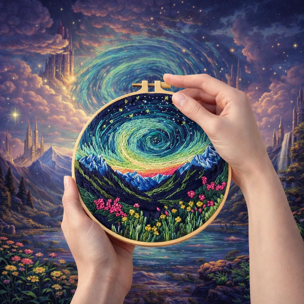 Embroidery kit-northern lights for beginners: hoop mountain landscape, starry night