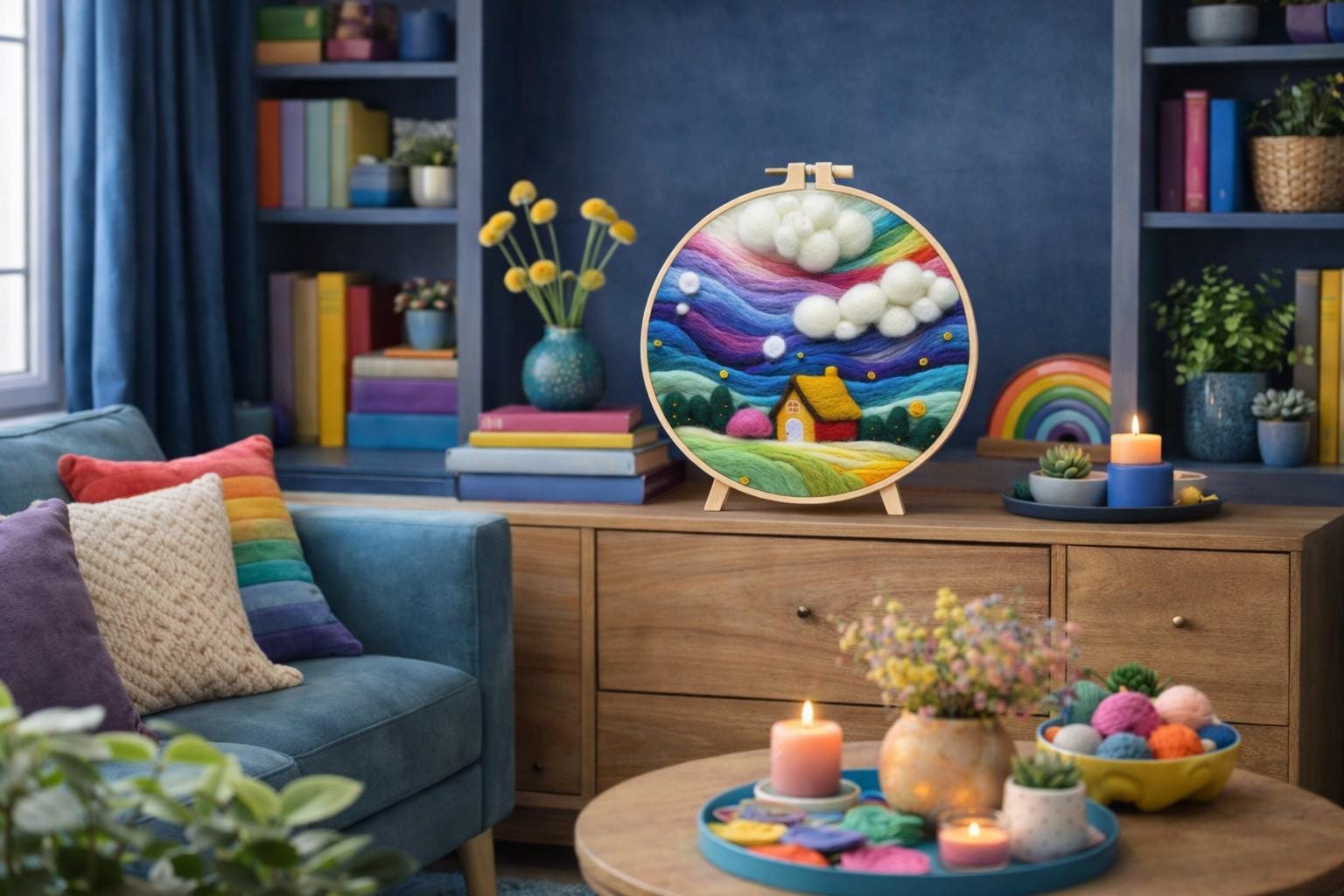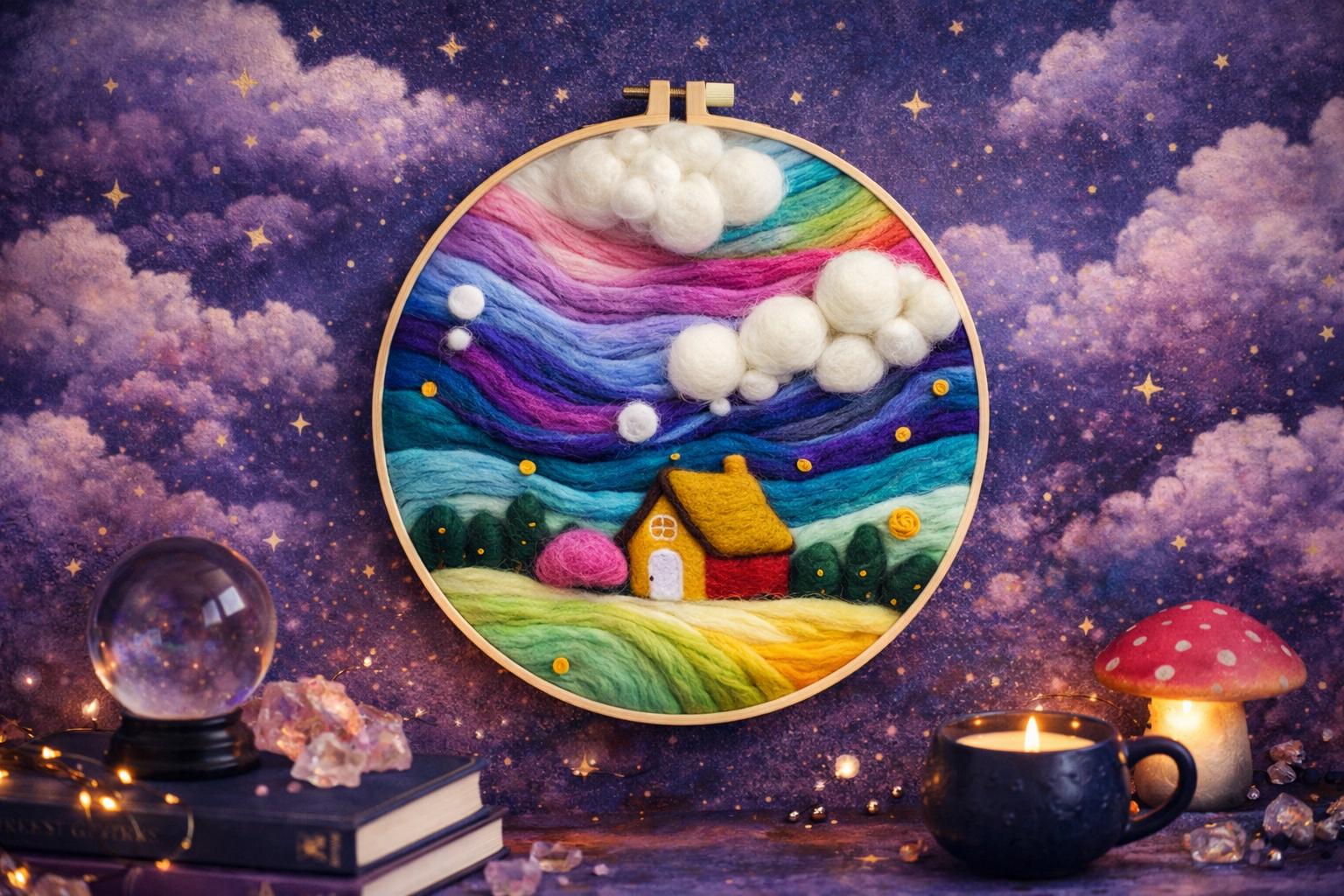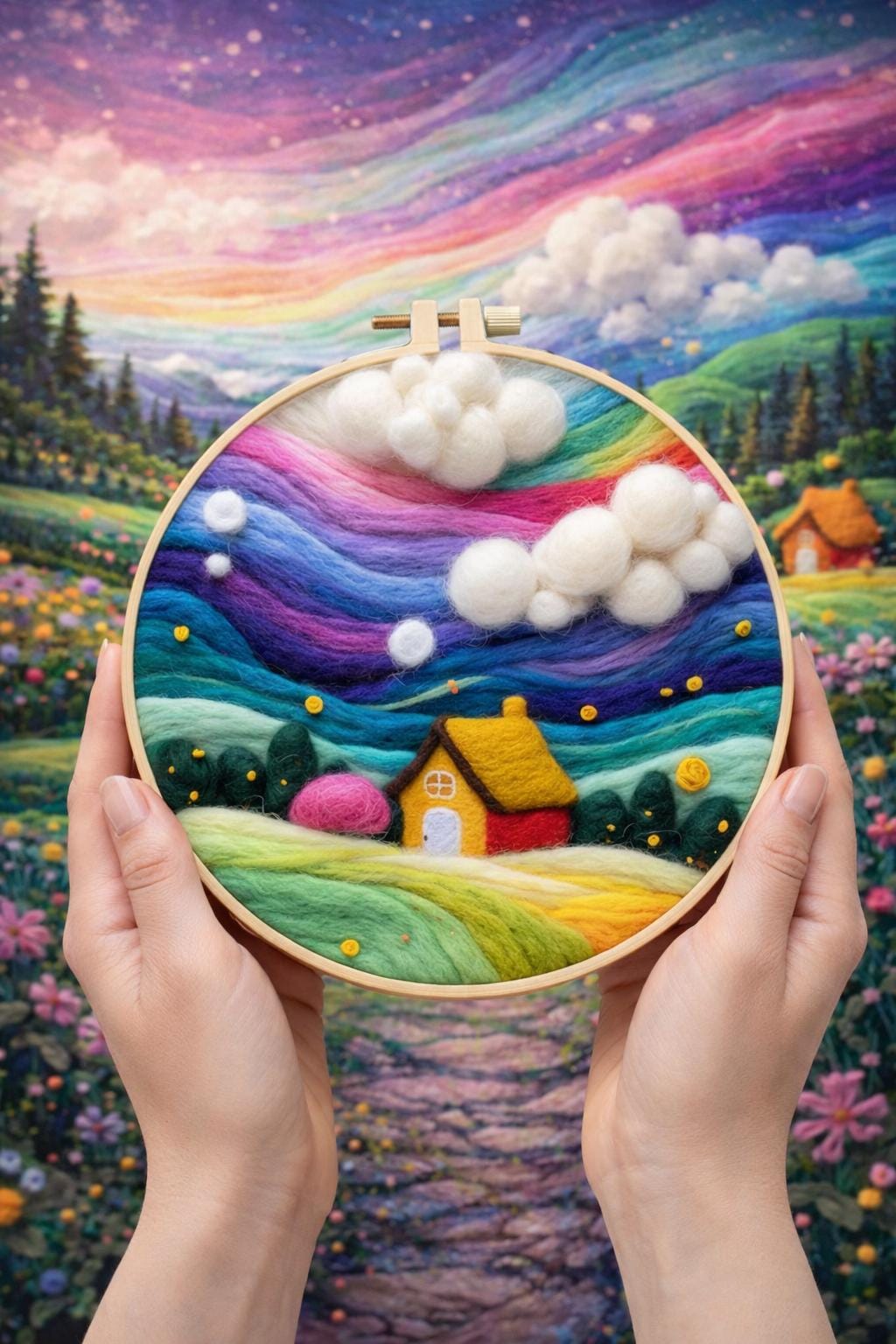 Needle Felting Kit for Beginners – Cottage Landscape Wool Painting, Colorful DIY Hoop Decoration, Felt Art Craft Kit