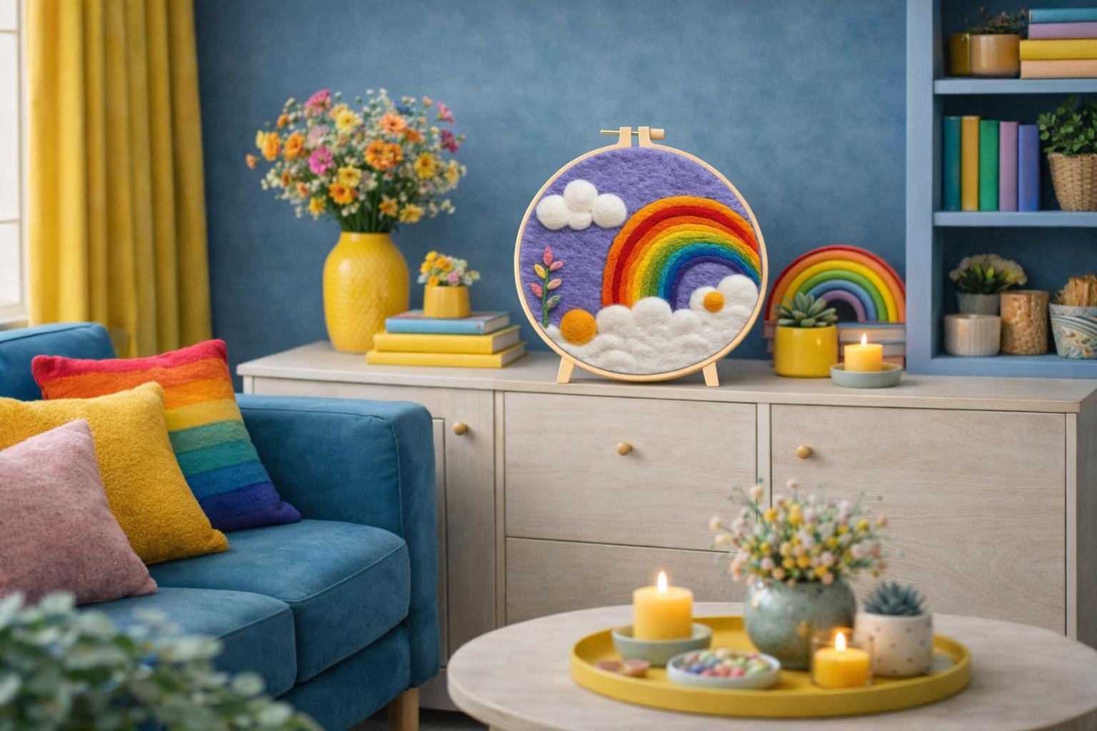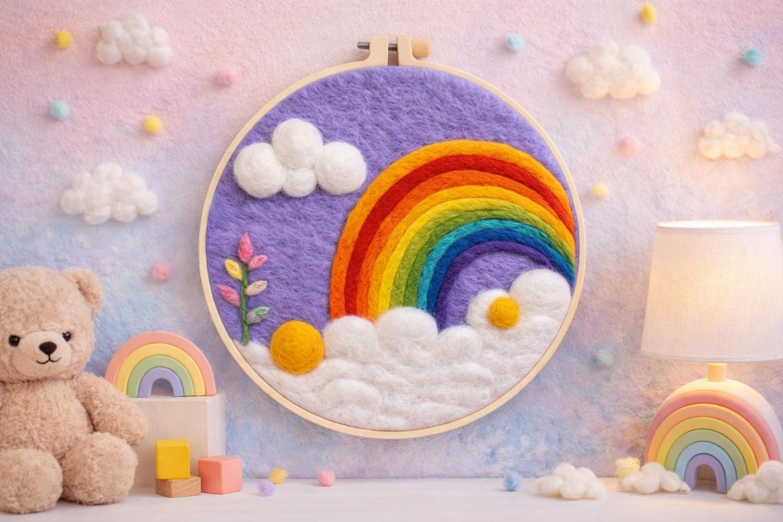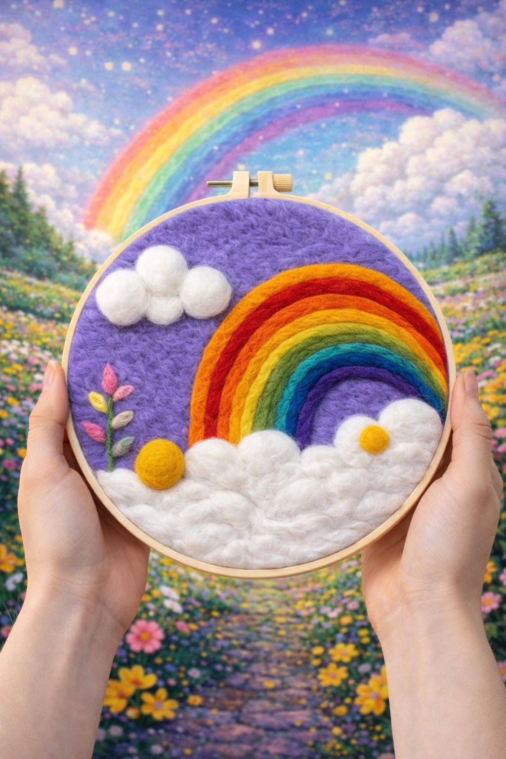 Rainbow Needle Felting Kit – Beginner Craft Set, Wool Painting, DIY Cloud and Sun Wall Decor