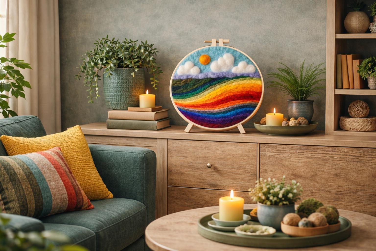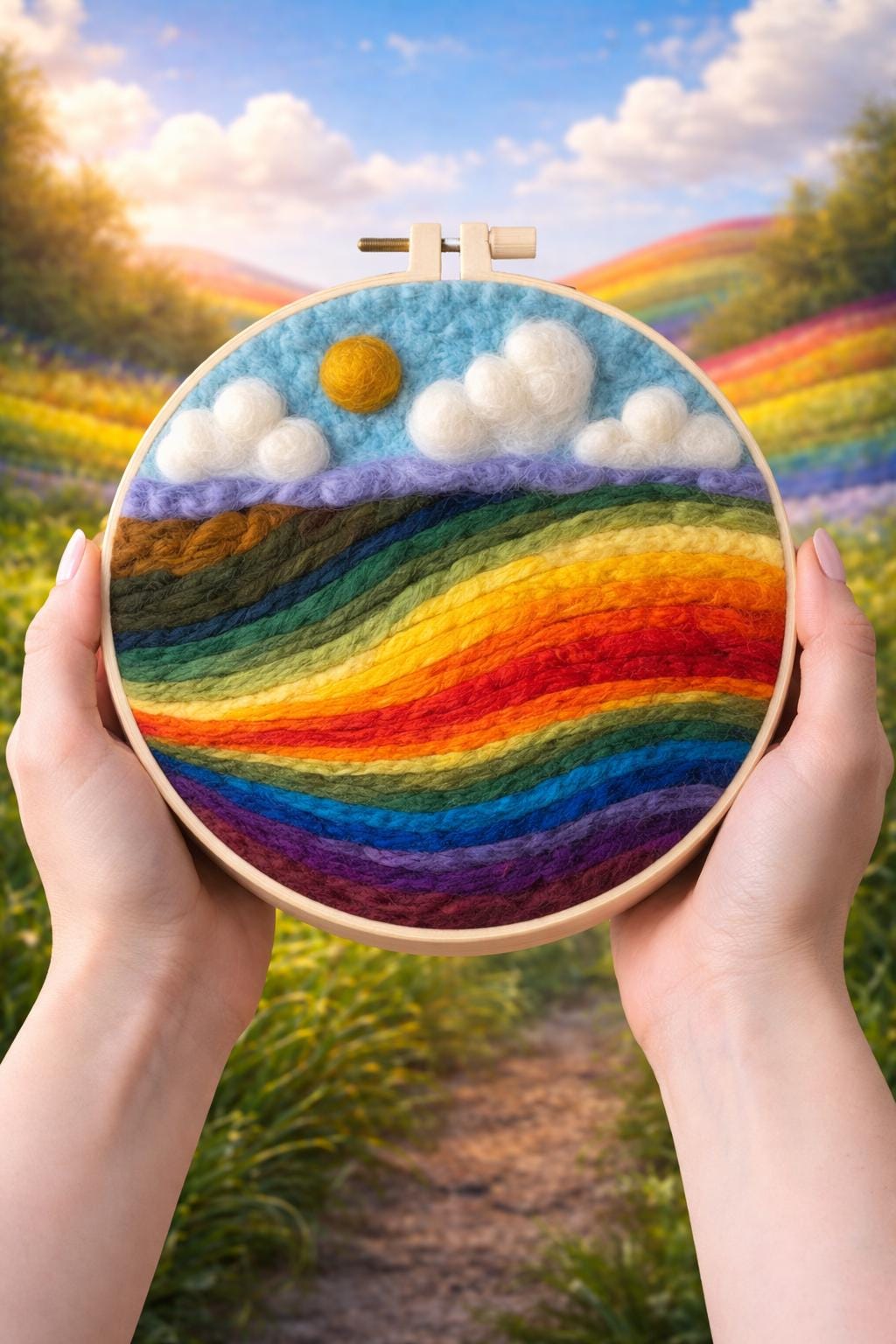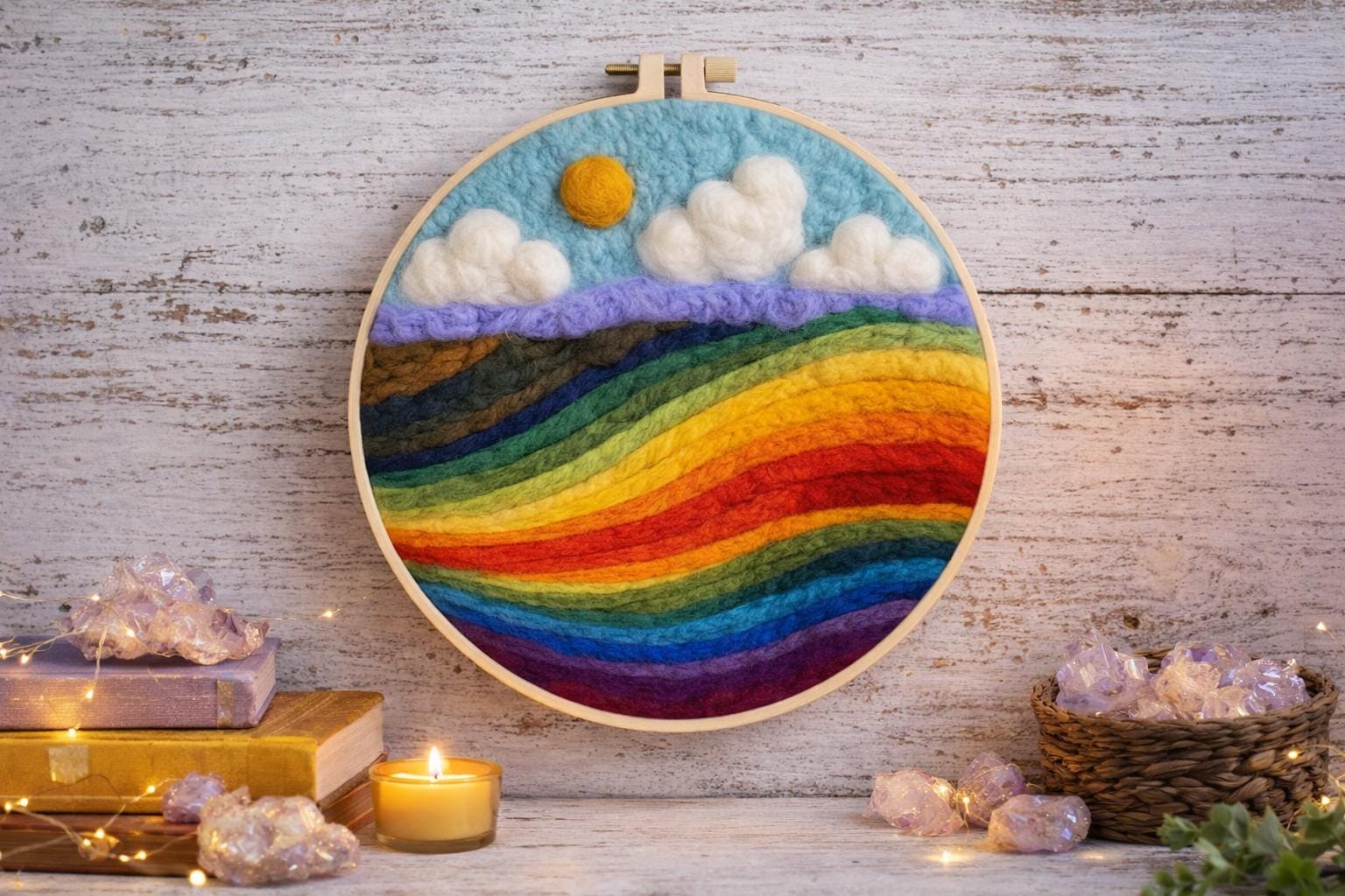 Rainbow Needle Felting Kit – Beginner Wool Painting Sunset Landscape, DIY Colorful Hoop Art