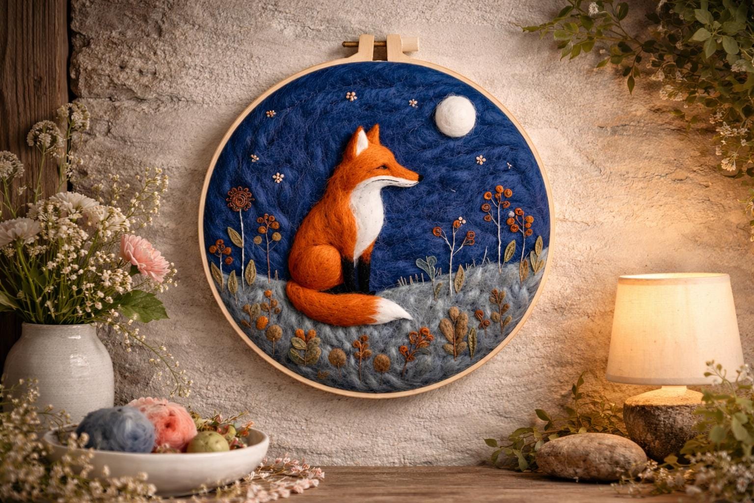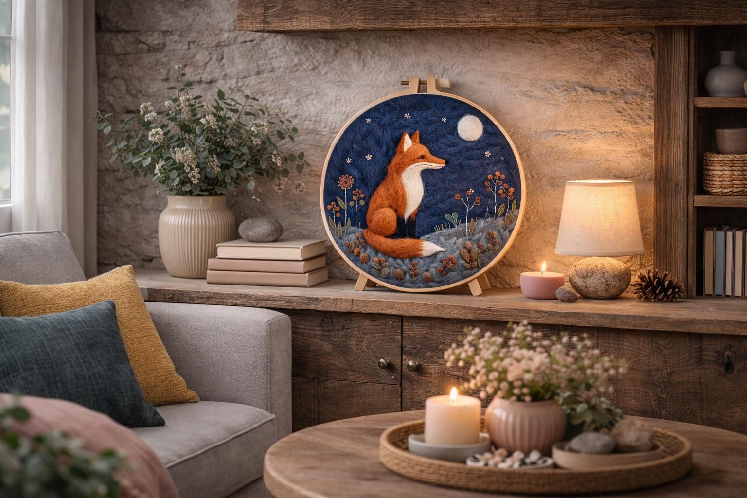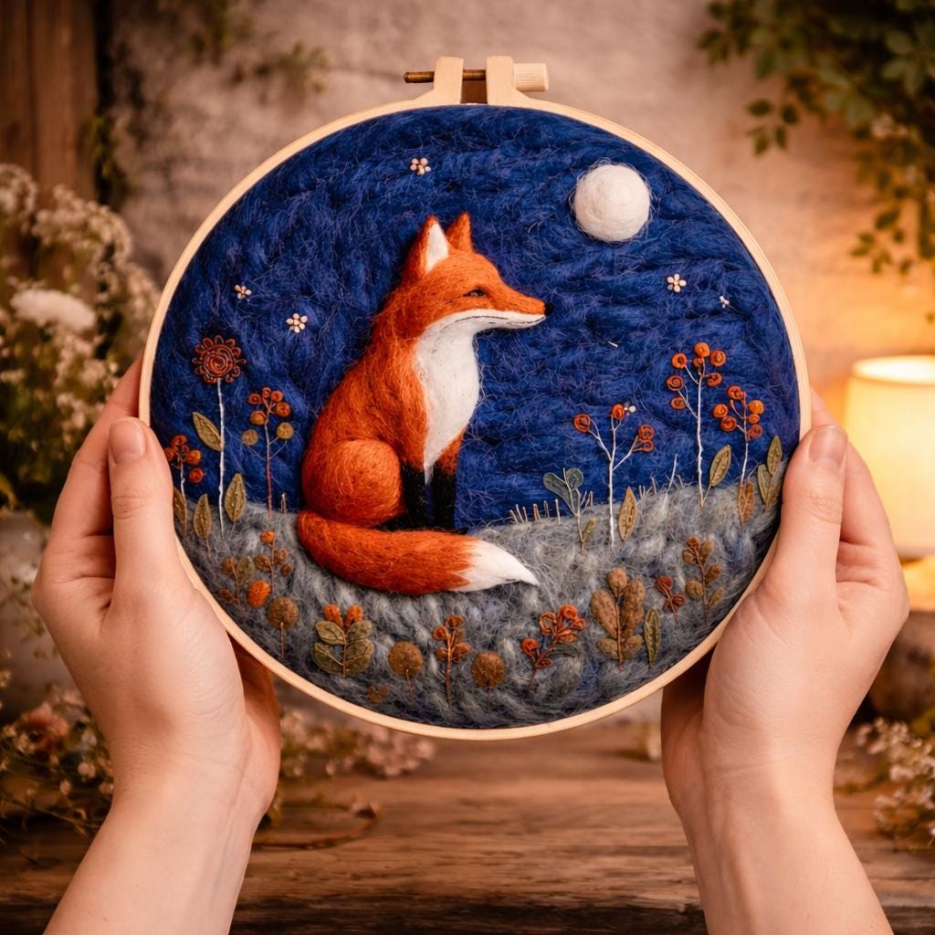 Moonlit Fox Needle Felting Kit – Woodland Animal Wool Art Hoop for Beginners