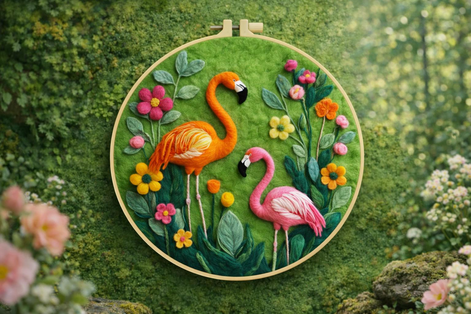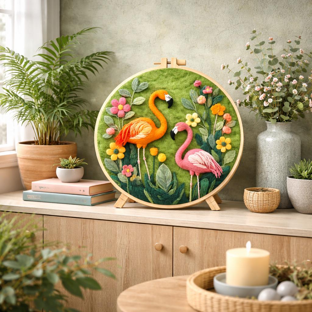 Pink Flamingo Needle Felting Kit DIY – Wool Embroidery Hoop Tropical Floral Wall Decor